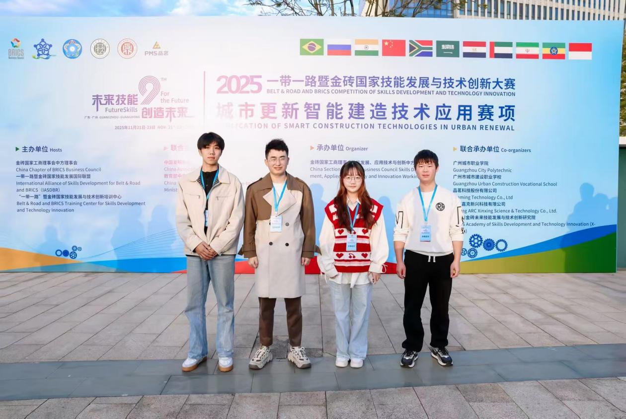 近日,2025“一带一路”暨金砖国家技能发展与技术创新大赛“城市更新智能建造技术应用赛项”全国总决赛在广州圆满落幕。经统计,此次大赛共有来自全国30个省、市、自治区的238所高校、785支队伍踊跃报名。经过层层选拔与严格评审,最终400支实力强劲的队伍成功会师广州,在全国总决赛的舞台上展开最终角逐。其中由江西工程学院智能制造与建造学院组成的第一队(队长:刘仁;队员:肖嘉宝、徐洋;指导老师:陈水根、李红艳)在此次大赛中荣获全国三等奖。