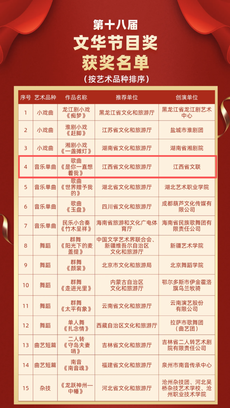 国际在线江西消息(记者 张震寰):11月4日晚,第十四届中国艺术节闭幕式上传来消息,由江西省文联创演的歌曲《是你一直想着我》荣获第十八届文华节目奖。