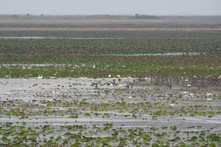 不同于南矶的天然湿地,这里是人类为候鸟搭建的“补给粮仓”,其诞生源于一场“留住白鹤”的爱心众筹。从最初的350亩“租地备食”,到当地将1000多亩藕田改造成“候鸟食堂”,并建设观鸟廊道、观鸟民宿等基础设施。保护小区被誉为“全世界距离白鹤最近的地方”,高峰期曾记录到数千只白鹤在此觅食。