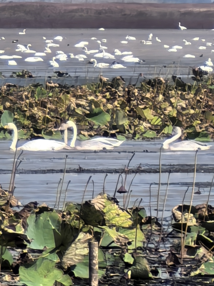 站在常湖岸边的矮堤上远眺,连绵成片的野莲虽已叶落茎枯,但其水下肥硕的块茎,却成了越冬候鸟梦寐以求的“粮仓”。这些野莲呈块状分布,将湖面分割成独特的带状景观,为万千候鸟提供了栖息与庇护的天然乐园。