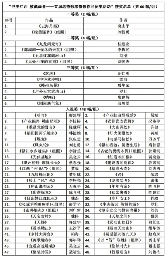 近日,“寻美江西 帧藏画卷——首届老摄影家摄影作品征集活动”评选结果正式揭晓。经过权威评委团的严格评审,共有60幅(组)凝聚光影艺术的佳作从全国248位作者投递的2150余幅(组)作品中脱颖而出,分获各奖项。