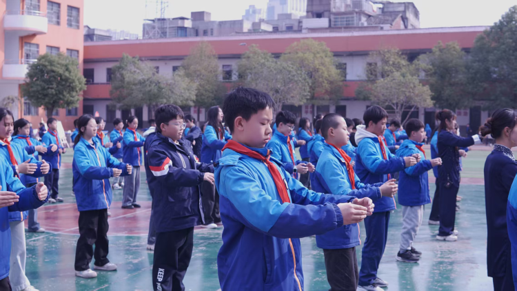 近日,江西省鹰潭市逸夫小学的操场上,学生们在专业教员的带领下练习太极基础招式,体验传统文化。