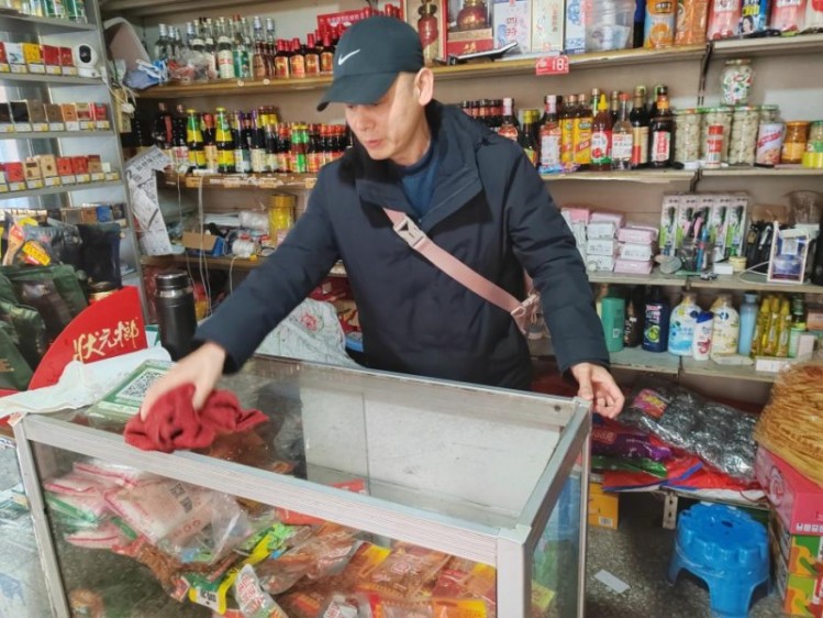(图为客户经理易斌在帮助客户整理店面卫生)