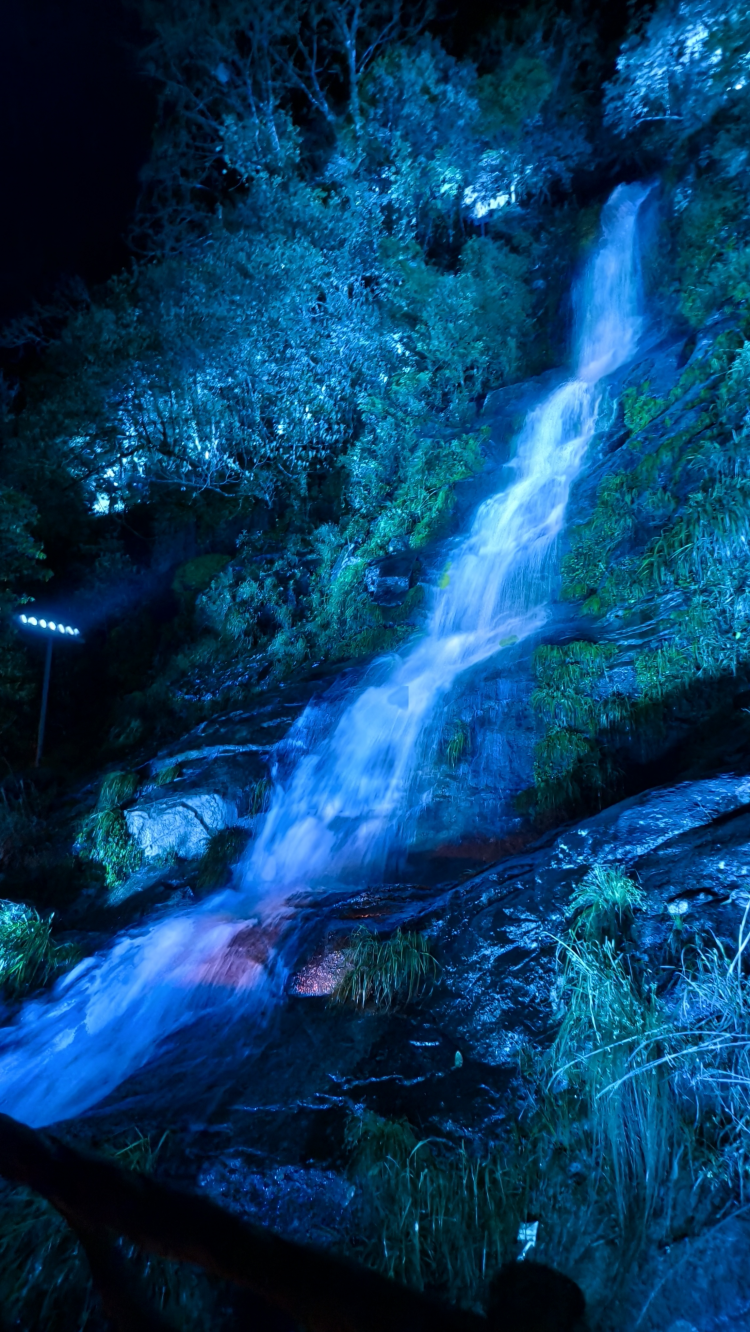 在青龙瀑布、壁峡、月光瀑布、五福堂、野牛瀑布五个核心点位,项目运用山体激光秀、峭壁光影秀、360°实景投影等技术,上演大型沉浸式秀演。在秀演之间的游线上,还设置了20多个互动节点。游客通过小程序可以参与AR集福游戏,在真实峡谷中寻找虚拟“福源”;可以邂逅AI驱动的数字精灵NPC,通过现场实景识别进行实时对话、领取任务;还能体验“声临奇境”“步步生福”“荧光竹海”等声光电互动装置,真正做到“一步一剧情,沉浸不中断”。